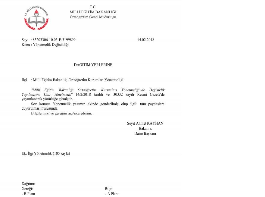 Milli Egitim Bakanligi Ortaogretim Kurumlari Yonetmeliginde Degisiklik